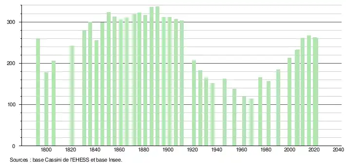 L'évolution du nombre d'habitants est connue à travers les recensements de la population effectués dans la commune depuis 1793. Pour les communes de moins de 10 000 habitants, une enquête de recensement portant sur toute la population est réalisée tous les cinq ans, les populations légales des années intermédiaires étant quant à elles estimées par interpolation ou extrapolation[44]. Pour la commune, le premier recensement exhaustif entrant dans le cadre du nouveau dispositif a été réalisé en 2005[45].