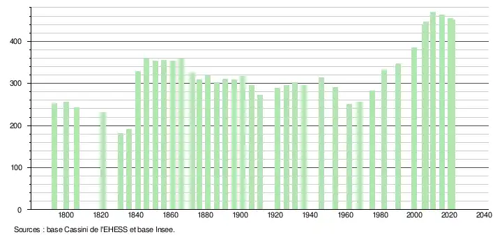 L'évolution du nombre d'habitants est connue à travers les recensements de la population effectués dans la commune depuis 1793. Pour les communes de moins de 10 000 habitants, une enquête de recensement portant sur toute la population est réalisée tous les cinq ans, les populations légales des années intermédiaires étant quant à elles estimées par interpolation ou extrapolation[51]. Pour la commune, le premier recensement exhaustif entrant dans le cadre du nouveau dispositif a été réalisé en 2005[52].