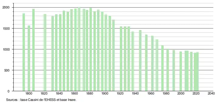 L'évolution du nombre d'habitants est connue à travers les recensements de la population effectués dans la commune depuis 1793. Pour les communes de moins de 10 000 habitants, une enquête de recensement portant sur toute la population est réalisée tous les cinq ans, les populations légales des années intermédiaires étant quant à elles estimées par interpolation ou extrapolation[21]. Pour la commune, le premier recensement exhaustif entrant dans le cadre du nouveau dispositif a été réalisé en 2008[22].