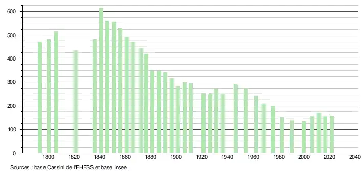 L'évolution du nombre d'habitants est connue à travers les recensements de la population effectués dans la commune depuis 1793. Pour les communes de moins de 10 000 habitants, une enquête de recensement portant sur toute la population est réalisée tous les cinq ans, les populations légales des années intermédiaires étant quant à elles estimées par interpolation ou extrapolation[22]. Pour la commune, le premier recensement exhaustif entrant dans le cadre du nouveau dispositif a été réalisé en 2006[23].