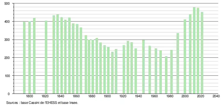 L'évolution du nombre d'habitants est connue à travers les recensements de la population effectués dans la commune depuis 1793. Pour les communes de moins de 10 000 habitants, une enquête de recensement portant sur toute la population est réalisée tous les cinq ans, les populations légales des années intermédiaires étant quant à elles estimées par interpolation ou extrapolation[22]. Pour la commune, le premier recensement exhaustif entrant dans le cadre du nouveau dispositif a été réalisé en 2006[23].
