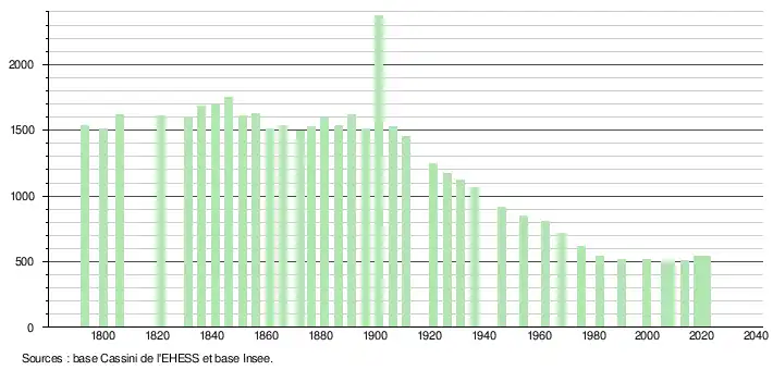 L'évolution du nombre d'habitants est connue à travers les recensements de la population effectués dans la commune depuis 1793. Pour les communes de moins de 10 000 habitants, une enquête de recensement portant sur toute la population est réalisée tous les cinq ans, les populations légales des années intermédiaires étant quant à elles estimées par interpolation ou extrapolation[16]. Pour la commune, le premier recensement exhaustif entrant dans le cadre du nouveau dispositif a été réalisé en 2008[17].