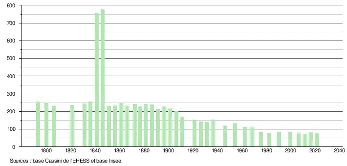 L'évolution du nombre d'habitants est connue à travers les recensements de la population effectués dans la commune depuis 1793. Pour les communes de moins de 10 000 habitants, une enquête de recensement portant sur toute la population est réalisée tous les cinq ans, les populations légales des années intermédiaires étant quant à elles estimées par interpolation ou extrapolation[24]. Pour la commune, le premier recensement exhaustif entrant dans le cadre du nouveau dispositif a été réalisé en 2006[25].