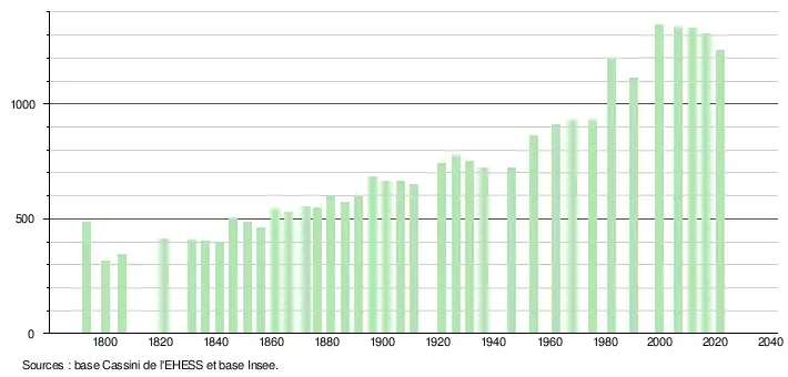 L'évolution du nombre d'habitants est connue à travers les recensements de la population effectués dans la commune depuis 1793. Pour les communes de moins de 10 000 habitants, une enquête de recensement portant sur toute la population est réalisée tous les cinq ans, les populations légales des années intermédiaires étant quant à elles estimées par interpolation ou extrapolation[19]. Pour la commune, le premier recensement exhaustif entrant dans le cadre du nouveau dispositif a été réalisé en 2006[20].