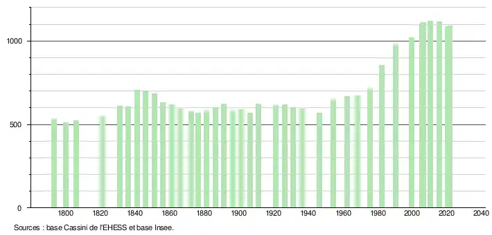 L'évolution du nombre d'habitants est connue à travers les recensements de la population effectués dans la commune depuis 1793. Pour les communes de moins de 10 000 habitants, une enquête de recensement portant sur toute la population est réalisée tous les cinq ans, les populations légales des années intermédiaires étant quant à elles estimées par interpolation ou extrapolation[21]. Pour la commune, le premier recensement exhaustif entrant dans le cadre du nouveau dispositif a été réalisé en 2005[22].