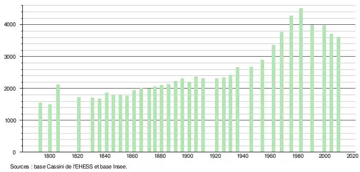 L'évolution du nombre d'habitants est connue à travers les recensements de la population effectués dans la commune depuis 1793. À partir du , les populations légales des communes sont publiées annuellement dans le cadre d'un recensement qui repose désormais sur une collecte d'information annuelle, concernant successivement tous les territoires communaux au cours d'une période de cinq ans. Pour les communes de moins de 10 000 habitants, une enquête de recensement portant sur toute la population est réalisée tous les cinq ans, les populations légales des années intermédiaires étant quant à elles estimées par interpolation ou extrapolation[22]. Pour la commune, le premier recensement exhaustif entrant dans le cadre du nouveau dispositif a été réalisé en 2004[23],[Note 2].