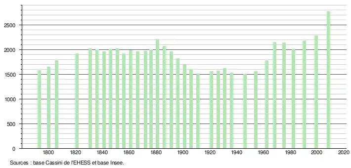 - Par convention dans Wikipédia, le principe a été retenu de n’afficher dans le tableau des recensements et le graphique, pour les populations légales postérieures à 1999, que les populations correspondant à une enquête exhaustive de recensement pour les communes de moins de 10 000 habitants, et que les populations des années 2006, 2011, 2016, etc. pour les communes de plus de 10 000 habitants, ainsi que la dernière population légale publiée par l’Insee pour l'ensemble des communes.