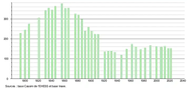L'évolution du nombre d'habitants est connue à travers les recensements de la population effectués dans la commune depuis 1793. Pour les communes de moins de 10 000 habitants, une enquête de recensement portant sur toute la population est réalisée tous les cinq ans, les populations légales des années intermédiaires étant quant à elles estimées par interpolation ou extrapolation[19]. Pour la commune, le premier recensement exhaustif entrant dans le cadre du nouveau dispositif a été réalisé en 2007[20].