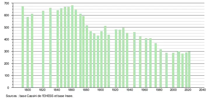 L'évolution du nombre d'habitants est connue à travers les recensements de la population effectués dans la commune depuis 1793. Pour les communes de moins de 10 000 habitants, une enquête de recensement portant sur toute la population est réalisée tous les cinq ans, les populations légales des années intermédiaires étant quant à elles estimées par interpolation ou extrapolation[26]. Pour la commune, le premier recensement exhaustif entrant dans le cadre du nouveau dispositif a été réalisé en 2007[27].