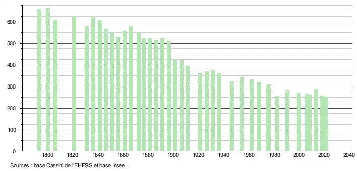 L'évolution du nombre d'habitants est connue à travers les recensements de la population effectués dans la commune depuis 1793. Pour les communes de moins de 10 000 habitants, une enquête de recensement portant sur toute la population est réalisée tous les cinq ans, les populations légales des années intermédiaires étant quant à elles estimées par interpolation ou extrapolation[15]. Pour la commune, le premier recensement exhaustif entrant dans le cadre du nouveau dispositif a été réalisé en 2008[16].