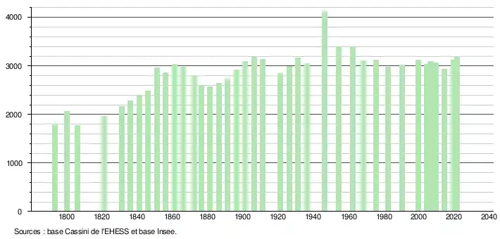 L'évolution du nombre d'habitants est connue à travers les recensements de la population effectués dans la commune depuis 1793. Pour les communes de moins de 10 000 habitants, une enquête de recensement portant sur toute la population est réalisée tous les cinq ans, les populations légales des années intermédiaires étant quant à elles estimées par interpolation ou extrapolation[49]. Pour la commune, le premier recensement exhaustif entrant dans le cadre du nouveau dispositif a été réalisé en 2004[50].