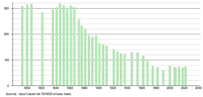 L'évolution du nombre d'habitants est connue à travers les recensements de la population effectués dans la commune depuis 1793. Pour les communes de moins de 10 000 habitants, une enquête de recensement portant sur toute la population est réalisée tous les cinq ans, les populations légales des années intermédiaires étant quant à elles estimées par interpolation ou extrapolation[22]. Pour la commune, le premier recensement exhaustif entrant dans le cadre du nouveau dispositif a été réalisé en 2007[23].