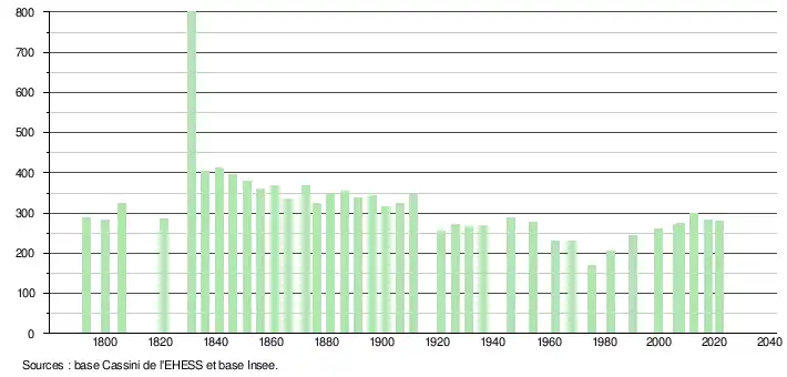 L'évolution du nombre d'habitants est connue à travers les recensements de la population effectués dans la commune depuis 1793. Pour les communes de moins de 10 000 habitants, une enquête de recensement portant sur toute la population est réalisée tous les cinq ans, les populations légales des années intermédiaires étant quant à elles estimées par interpolation ou extrapolation[24]. Pour la commune, le premier recensement exhaustif entrant dans le cadre du nouveau dispositif a été réalisé en 2007[25].