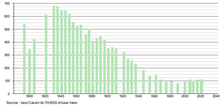 L'évolution du nombre d'habitants est connue à travers les recensements de la population effectués dans la commune depuis 1793. Pour les communes de moins de 10 000 habitants, une enquête de recensement portant sur toute la population est réalisée tous les cinq ans, les populations légales des années intermédiaires étant quant à elles estimées par interpolation ou extrapolation[18]. Pour la commune, le premier recensement exhaustif entrant dans le cadre du nouveau dispositif a été réalisé en 2005[19].