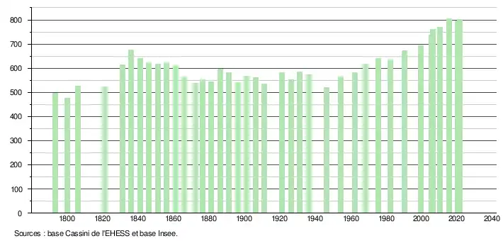 L'évolution du nombre d'habitants est connue à travers les recensements de la population effectués dans la commune depuis 1793. Pour les communes de moins de 10 000 habitants, une enquête de recensement portant sur toute la population est réalisée tous les cinq ans, les populations légales des années intermédiaires étant quant à elles estimées par interpolation ou extrapolation[33]. Pour la commune, le premier recensement exhaustif entrant dans le cadre du nouveau dispositif a été réalisé en 2005[34].