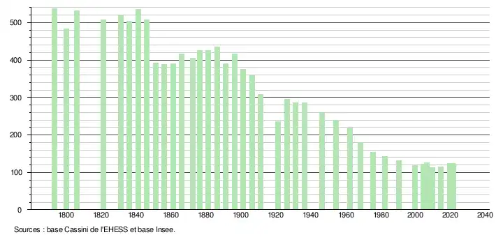 L'évolution du nombre d'habitants est connue à travers les recensements de la population effectués dans la commune depuis 1793. Pour les communes de moins de 10 000 habitants, une enquête de recensement portant sur toute la population est réalisée tous les cinq ans, les populations légales des années intermédiaires étant quant à elles estimées par interpolation ou extrapolation[14]. Pour la commune, le premier recensement exhaustif entrant dans le cadre du nouveau dispositif a été réalisé en 2004[15].