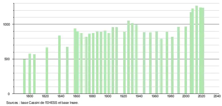 L'évolution du nombre d'habitants est connue à travers les recensements de la population effectués dans la commune depuis 1793. Pour les communes de moins de 10 000 habitants, une enquête de recensement portant sur toute la population est réalisée tous les cinq ans, les populations légales des années intermédiaires étant quant à elles estimées par interpolation ou extrapolation[15]. Pour la commune, le premier recensement exhaustif entrant dans le cadre du nouveau dispositif a été réalisé en 2008[16].