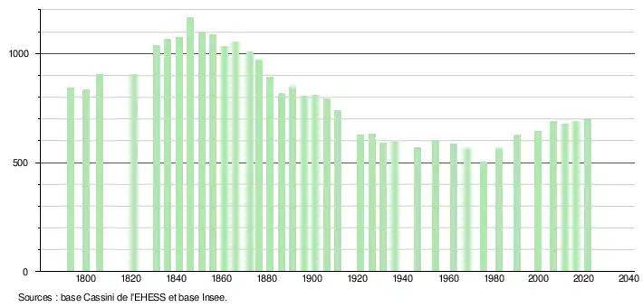 L'évolution du nombre d'habitants est connue à travers les recensements de la population effectués dans la commune depuis 1793. Pour les communes de moins de 10 000 habitants, une enquête de recensement portant sur toute la population est réalisée tous les cinq ans, les populations légales des années intermédiaires étant quant à elles estimées par interpolation ou extrapolation[18]. Pour la commune, le premier recensement exhaustif entrant dans le cadre du nouveau dispositif a été réalisé en 2006[19].