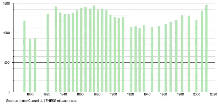 L'évolution du nombre d'habitants est connue à travers les recensements de la population effectués dans la commune depuis 1793. À partir du , les populations légales des communes sont publiées annuellement dans le cadre d'un recensement qui repose désormais sur une collecte d'information annuelle, concernant successivement tous les territoires communaux au cours d'une période de cinq ans. Pour les communes de moins de 10 000 habitants, une enquête de recensement portant sur toute la population est réalisée tous les cinq ans, les populations légales des années intermédiaires étant quant à elles estimées par interpolation ou extrapolation[10]. Pour la commune, le premier recensement exhaustif entrant dans le cadre du nouveau dispositif a été réalisé en 2006[11],[Note 1].
