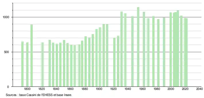 L'évolution du nombre d'habitants est connue à travers les recensements de la population effectués dans la commune depuis 1793. Pour les communes de moins de 10 000 habitants, une enquête de recensement portant sur toute la population est réalisée tous les cinq ans, les populations légales des années intermédiaires étant quant à elles estimées par interpolation ou extrapolation[24]. Pour la commune, le premier recensement exhaustif entrant dans le cadre du nouveau dispositif a été réalisé en 2004[25].