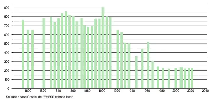 L'évolution du nombre d'habitants est connue à travers les recensements de la population effectués dans la commune depuis 1793. Pour les communes de moins de 10 000 habitants, une enquête de recensement portant sur toute la population est réalisée tous les cinq ans, les populations légales des années intermédiaires étant quant à elles estimées par interpolation ou extrapolation[23]. Pour la commune, le premier recensement exhaustif entrant dans le cadre du nouveau dispositif a été réalisé en 2007[24].