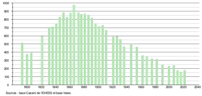 L'évolution du nombre d'habitants est connue à travers les recensements de la population effectués dans la commune depuis 1793. Pour les communes de moins de 10 000 habitants, une enquête de recensement portant sur toute la population est réalisée tous les cinq ans, les populations légales des années intermédiaires étant quant à elles estimées par interpolation ou extrapolation[16]. Pour la commune, le premier recensement exhaustif entrant dans le cadre du nouveau dispositif a été réalisé en 2006[17].