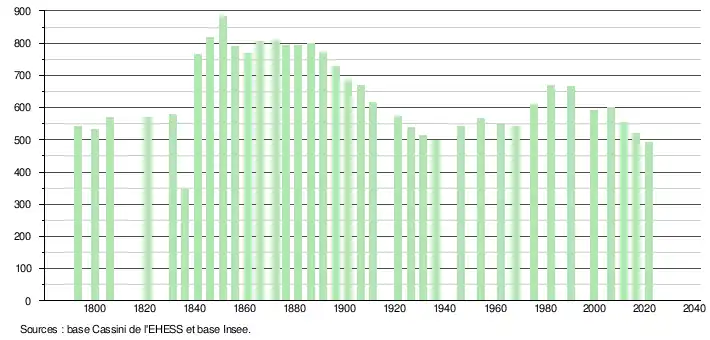 L'évolution du nombre d'habitants est connue à travers les recensements de la population effectués dans la commune depuis 1793. Pour les communes de moins de 10 000 habitants, une enquête de recensement portant sur toute la population est réalisée tous les cinq ans, les populations légales des années intermédiaires étant quant à elles estimées par interpolation ou extrapolation[27]. Pour la commune, le premier recensement exhaustif entrant dans le cadre du nouveau dispositif a été réalisé en 2006[28].