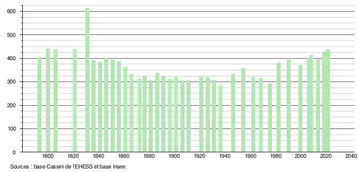 L'évolution du nombre d'habitants est connue à travers les recensements de la population effectués dans la commune depuis 1793. Pour les communes de moins de 10 000 habitants, une enquête de recensement portant sur toute la population est réalisée tous les cinq ans, les populations légales des années intermédiaires étant quant à elles estimées par interpolation ou extrapolation[26]. Pour la commune, le premier recensement exhaustif entrant dans le cadre du nouveau dispositif a été réalisé en 2008[27].