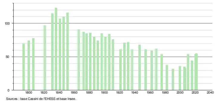 L'évolution du nombre d'habitants est connue à travers les recensements de la population effectués dans la commune depuis 1793. Pour les communes de moins de 10 000 habitants, une enquête de recensement portant sur toute la population est réalisée tous les cinq ans, les populations légales des années intermédiaires étant quant à elles estimées par interpolation ou extrapolation[18]. Pour la commune, le premier recensement exhaustif entrant dans le cadre du nouveau dispositif a été réalisé en 2005[19].