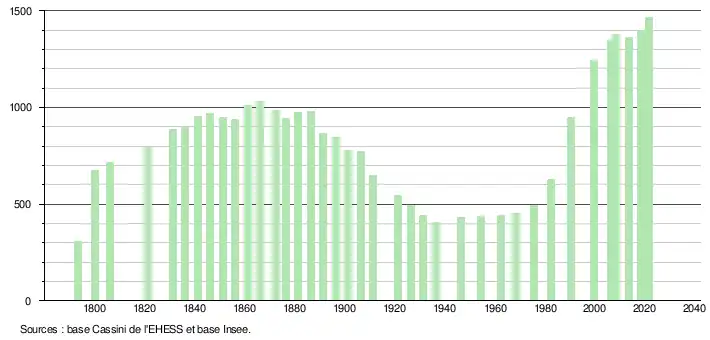 L'évolution du nombre d'habitants est connue à travers les recensements de la population effectués dans la commune depuis 1793. Pour les communes de moins de 10 000 habitants, une enquête de recensement portant sur toute la population est réalisée tous les cinq ans, les populations légales des années intermédiaires étant quant à elles estimées par interpolation ou extrapolation[21]. Pour la commune, le premier recensement exhaustif entrant dans le cadre du nouveau dispositif a été réalisé en 2008[22].