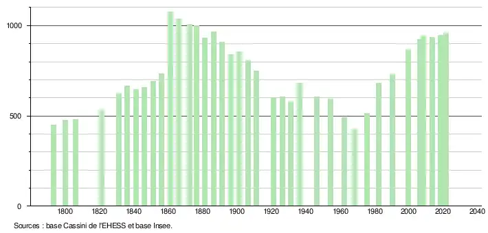 L'évolution du nombre d'habitants est connue à travers les recensements de la population effectués dans la commune depuis 1793. Pour les communes de moins de 10 000 habitants, une enquête de recensement portant sur toute la population est réalisée tous les cinq ans, les populations légales des années intermédiaires étant quant à elles estimées par interpolation ou extrapolation[22]. Pour la commune, le premier recensement exhaustif entrant dans le cadre du nouveau dispositif a été réalisé en 2008[23].