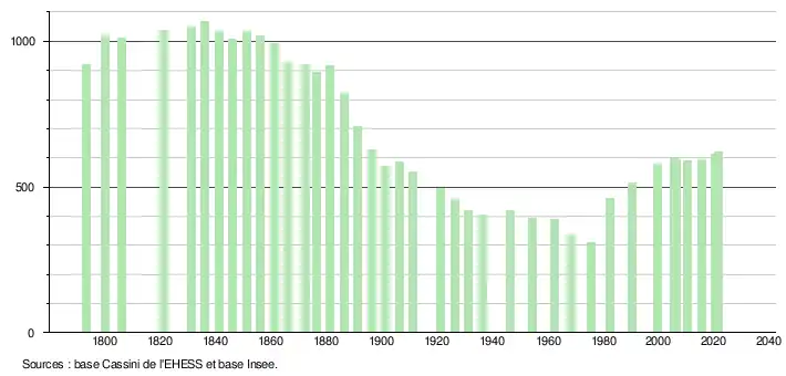 L'évolution du nombre d'habitants est connue à travers les recensements de la population effectués dans la commune depuis 1793. Pour les communes de moins de 10 000 habitants, une enquête de recensement portant sur toute la population est réalisée tous les cinq ans, les populations légales des années intermédiaires étant quant à elles estimées par interpolation ou extrapolation[21]. Pour la commune, le premier recensement exhaustif entrant dans le cadre du nouveau dispositif a été réalisé en 2005[22].