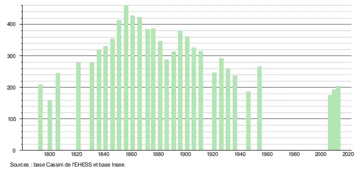 L'évolution du nombre d'habitants est connue à travers les recensements de la population effectués dans la commune depuis 1793. Pour les communes de moins de 10 000 habitants, une enquête de recensement portant sur toute la population est réalisée tous les cinq ans, les populations légales des années intermédiaires étant quant à elles estimées par interpolation ou extrapolation[3]. Pour la commune, le premier recensement exhaustif entrant dans le cadre du nouveau dispositif a été réalisé en 2004[4].