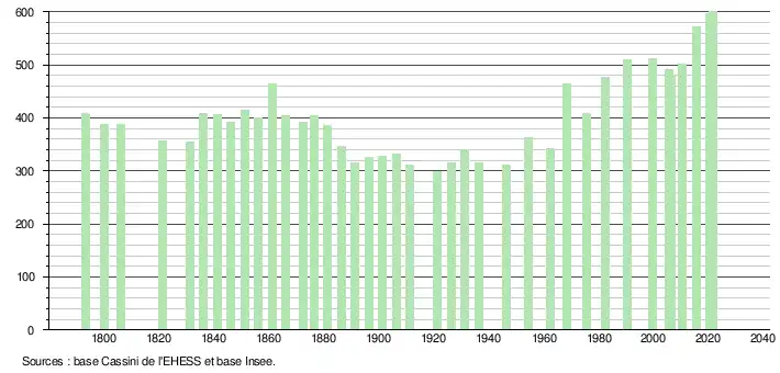 L'évolution du nombre d'habitants est connue à travers les recensements de la population effectués dans la commune depuis 1793. Pour les communes de moins de 10 000 habitants, une enquête de recensement portant sur toute la population est réalisée tous les cinq ans, les populations légales des années intermédiaires étant quant à elles estimées par interpolation ou extrapolation[15]. Pour la commune, le premier recensement exhaustif entrant dans le cadre du nouveau dispositif a été réalisé en 2005[16].