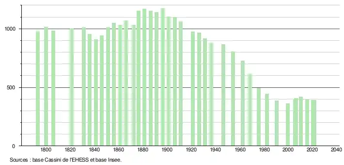 L'évolution du nombre d'habitants est connue à travers les recensements de la population effectués dans la commune depuis 1793. Pour les communes de moins de 10 000 habitants, une enquête de recensement portant sur toute la population est réalisée tous les cinq ans, les populations légales des années intermédiaires étant quant à elles estimées par interpolation ou extrapolation[21]. Pour la commune, le premier recensement exhaustif entrant dans le cadre du nouveau dispositif a été réalisé en 2005[22].