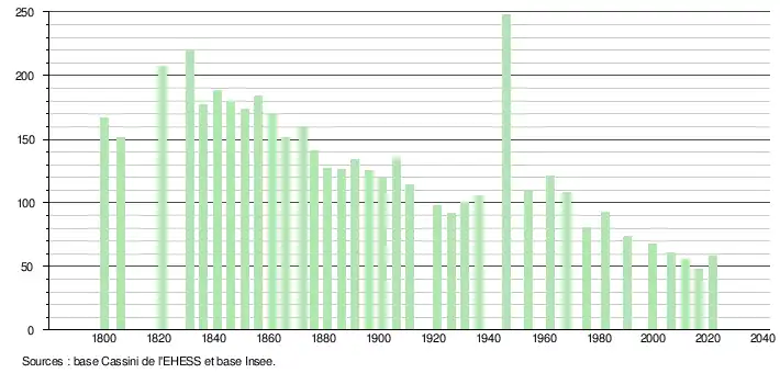 L'évolution du nombre d'habitants est connue à travers les recensements de la population effectués dans la commune depuis 1800. Pour les communes de moins de 10 000 habitants, une enquête de recensement portant sur toute la population est réalisée tous les cinq ans, les populations légales des années intermédiaires étant quant à elles estimées par interpolation ou extrapolation[32]. Pour la commune, le premier recensement exhaustif entrant dans le cadre du nouveau dispositif a été réalisé en 2006[33].