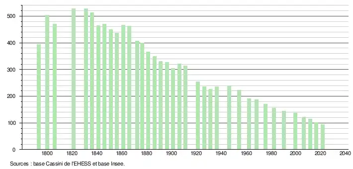 L'évolution du nombre d'habitants est connue à travers les recensements de la population effectués dans la commune depuis 1793. Pour les communes de moins de 10 000 habitants, une enquête de recensement portant sur toute la population est réalisée tous les cinq ans, les populations légales des années intermédiaires étant quant à elles estimées par interpolation ou extrapolation[17]. Pour la commune, le premier recensement exhaustif entrant dans le cadre du nouveau dispositif a été réalisé en 2006[18].
