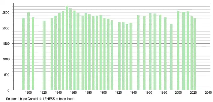 L'évolution du nombre d'habitants est connue à travers les recensements de la population effectués dans la commune depuis 1793. Pour les communes de moins de 10 000 habitants, une enquête de recensement portant sur toute la population est réalisée tous les cinq ans, les populations légales des années intermédiaires étant quant à elles estimées par interpolation ou extrapolation[39]. Pour la commune, le premier recensement exhaustif entrant dans le cadre du nouveau dispositif a été réalisé en 2007[40].