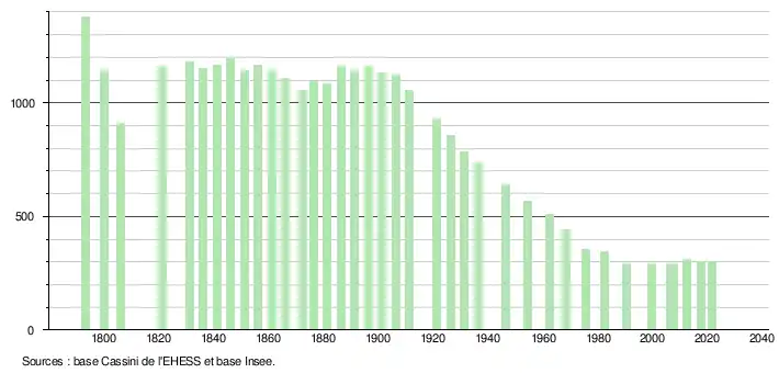 L'évolution du nombre d'habitants est connue à travers les recensements de la population effectués dans la commune depuis 1793. Pour les communes de moins de 10 000 habitants, une enquête de recensement portant sur toute la population est réalisée tous les cinq ans, les populations légales des années intermédiaires étant quant à elles estimées par interpolation ou extrapolation[24]. Pour la commune, le premier recensement exhaustif entrant dans le cadre du nouveau dispositif a été réalisé en 2007[25].