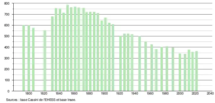 L'évolution du nombre d'habitants est connue à travers les recensements de la population effectués dans la commune depuis 1793. Pour les communes de moins de 10 000 habitants, une enquête de recensement portant sur toute la population est réalisée tous les cinq ans, les populations légales des années intermédiaires étant quant à elles estimées par interpolation ou extrapolation[14]. Pour la commune, le premier recensement exhaustif entrant dans le cadre du nouveau dispositif a été réalisé en 2006[15].