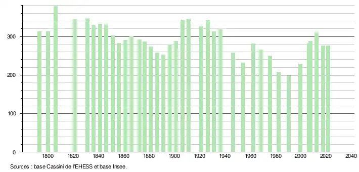 L'évolution du nombre d'habitants est connue à travers les recensements de la population effectués dans la commune depuis 1793. Pour les communes de moins de 10 000 habitants, une enquête de recensement portant sur toute la population est réalisée tous les cinq ans, les populations légales des années intermédiaires étant quant à elles estimées par interpolation ou extrapolation[24]. Pour la commune, le premier recensement exhaustif entrant dans le cadre du nouveau dispositif a été réalisé en 2007[25].