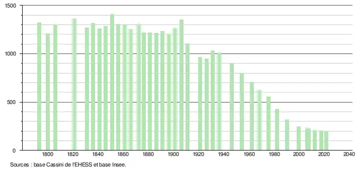 L'évolution du nombre d'habitants est connue à travers les recensements de la population effectués dans la commune depuis 1793. Pour les communes de moins de 10 000 habitants, une enquête de recensement portant sur toute la population est réalisée tous les cinq ans, les populations légales des années intermédiaires étant quant à elles estimées par interpolation ou extrapolation[7]. Pour la commune, le premier recensement exhaustif entrant dans le cadre du nouveau dispositif a été réalisé en 2007[8].