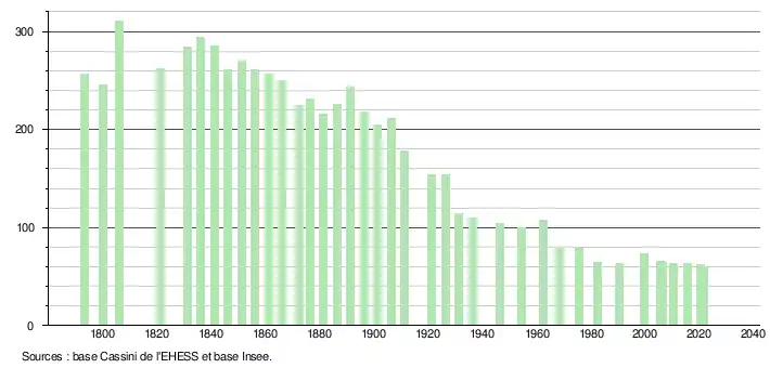 L'évolution du nombre d'habitants est connue à travers les recensements de la population effectués dans la commune depuis 1793. Pour les communes de moins de 10 000 habitants, une enquête de recensement portant sur toute la population est réalisée tous les cinq ans, les populations légales des années intermédiaires étant quant à elles estimées par interpolation ou extrapolation[26]. Pour la commune, le premier recensement exhaustif entrant dans le cadre du nouveau dispositif a été réalisé en 2005[27].