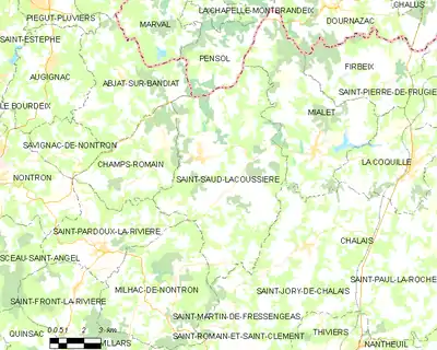 Saint-Saud-Lacoussière est limitrophe de huit autres communes dont une dans le département de la Haute-Vienne.