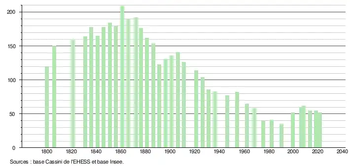 L'évolution du nombre d'habitants est connue à travers les recensements de la population effectués dans la commune depuis 1800. Pour les communes de moins de 10 000 habitants, une enquête de recensement portant sur toute la population est réalisée tous les cinq ans, les populations légales des années intermédiaires étant quant à elles estimées par interpolation ou extrapolation[16]. Pour la commune, le premier recensement exhaustif entrant dans le cadre du nouveau dispositif a été réalisé en 2008[17].