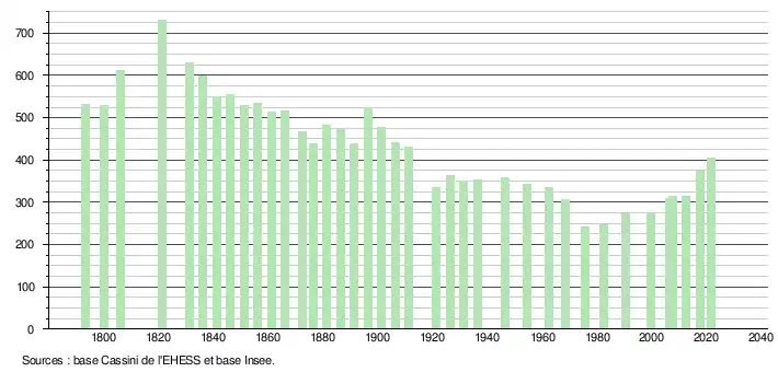 L'évolution du nombre d'habitants est connue à travers les recensements de la population effectués dans la commune depuis 1793. Pour les communes de moins de 10 000 habitants, une enquête de recensement portant sur toute la population est réalisée tous les cinq ans, les populations légales des années intermédiaires étant quant à elles estimées par interpolation ou extrapolation[19]. Pour la commune, le premier recensement exhaustif entrant dans le cadre du nouveau dispositif a été réalisé en 2007[20].