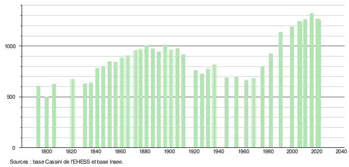 L'évolution du nombre d'habitants est connue à travers les recensements de la population effectués dans la commune depuis 1793. Pour les communes de moins de 10 000 habitants, une enquête de recensement portant sur toute la population est réalisée tous les cinq ans, les populations légales des années intermédiaires étant quant à elles estimées par interpolation ou extrapolation[27]. Pour la commune, le premier recensement exhaustif entrant dans le cadre du nouveau dispositif a été réalisé en 2005[28].