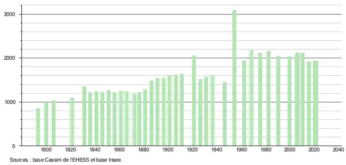 L'évolution du nombre d'habitants est connue à travers les recensements de la population effectués dans la commune depuis 1793. Pour les communes de moins de 10 000 habitants, une enquête de recensement portant sur toute la population est réalisée tous les cinq ans, les populations légales des années intermédiaires étant quant à elles estimées par interpolation ou extrapolation[20]. Pour la commune, le premier recensement exhaustif entrant dans le cadre du nouveau dispositif a été réalisé en 2005[21].