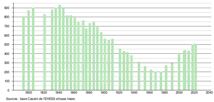 L'évolution du nombre d'habitants est connue à travers les recensements de la population effectués dans la commune depuis 1793. Pour les communes de moins de 10 000 habitants, une enquête de recensement portant sur toute la population est réalisée tous les cinq ans, les populations légales des années intermédiaires étant quant à elles estimées par interpolation ou extrapolation[18]. Pour la commune, le premier recensement exhaustif entrant dans le cadre du nouveau dispositif a été réalisé en 2007[19].