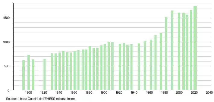 L'évolution du nombre d'habitants est connue à travers les recensements de la population effectués dans la commune depuis 1793. Pour les communes de moins de 10 000 habitants, une enquête de recensement portant sur toute la population est réalisée tous les cinq ans, les populations légales des années intermédiaires étant quant à elles estimées par interpolation ou extrapolation[28]. Pour la commune, le premier recensement exhaustif entrant dans le cadre du nouveau dispositif a été réalisé en 2005[29].